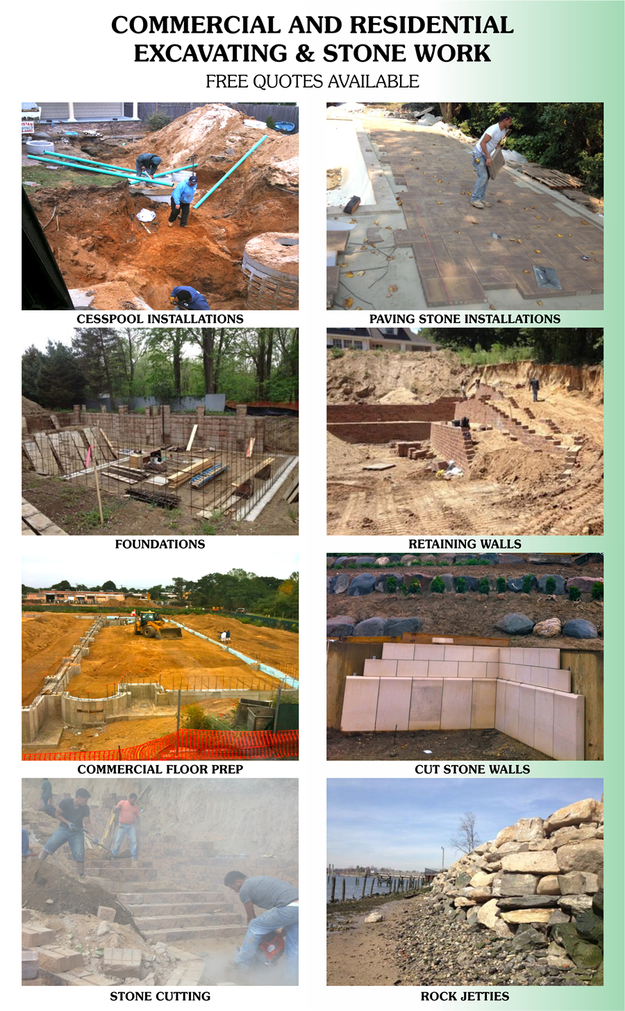 | Need a new look? Look no further than J&R! We can transform your Commercial or Residential outdoor space with our custom paver work. From new walkways, patios, driveway borders, and retaining walls, to name a few. Our hands on owners and operators will work with you to enhance the appearance of your home or business just in time for the summer months. Commercial and Residential Excavating & Stone Work, Free Quotes Available Cesspool Installations, Paving Stone Installations, Foundations, Retaining Walls, Commercial Floor Prep, Cut Stone Walls, Stone Cutting, Rock Jetties. | |||||||